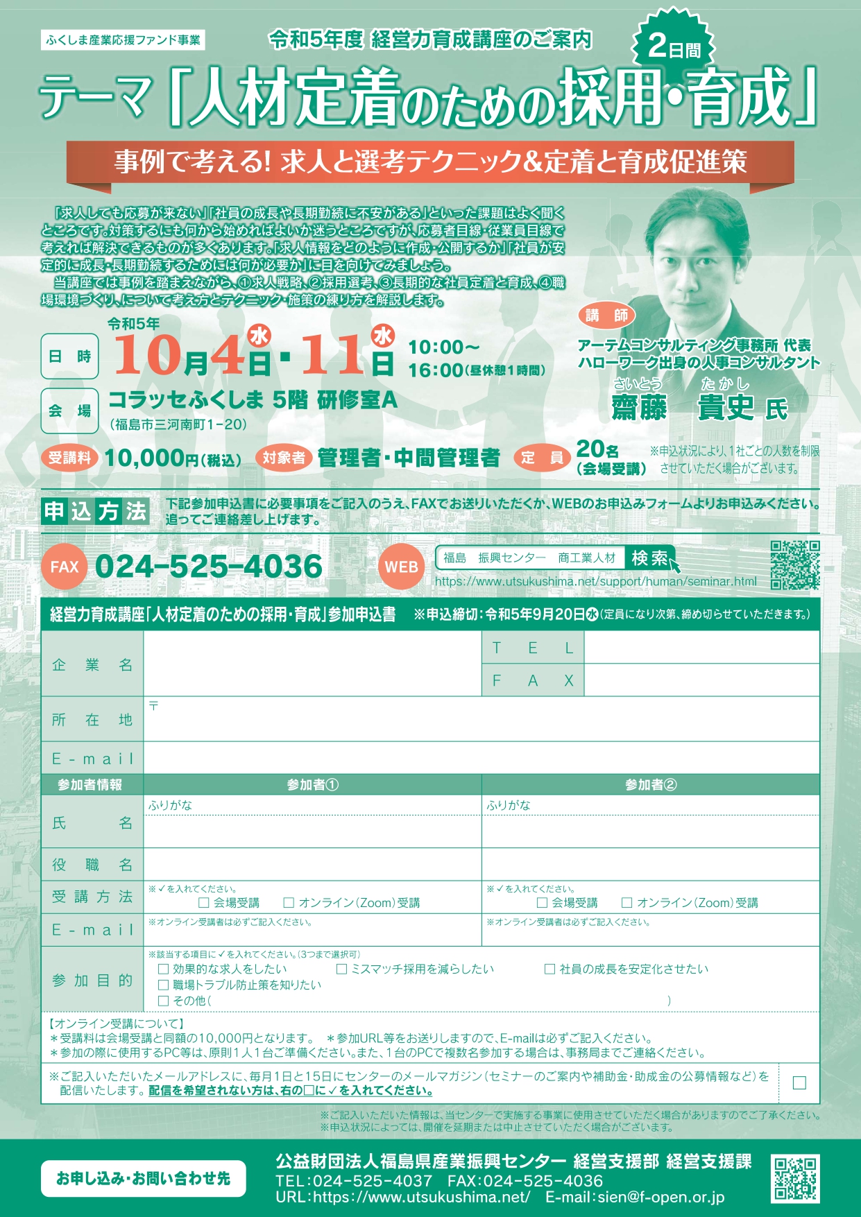 - 2023年10月4日(水)・11日(水)実施、【人材定着のための採用・育成/(公財)福島県産業振興センター主催】受講者募集中(申込締切9/20)