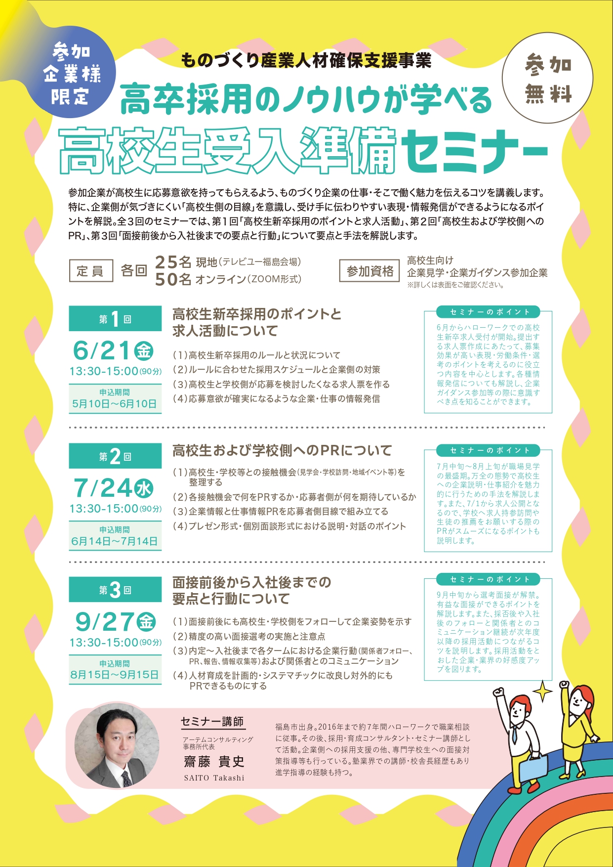 - 2024年06月21日(金)「高卒採用のノウハウが学べる 高校生受入準備セミナー第1回: 高校生新卒採用のポイントと求人活動について」(福島県ものづくり産業人材確保支援事業)実施(申込締切6/10)